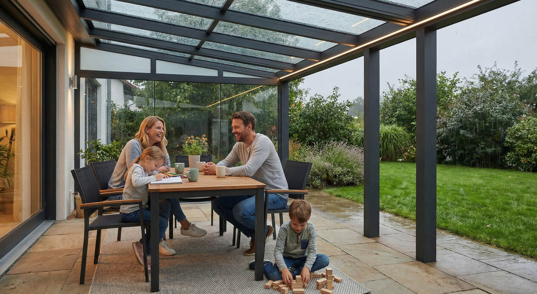 Glasschiebewände oder feste Seitenteile bieten zusätzlichen Schutz und verwandeln die Terrasse in einen geschlossenen Raum.